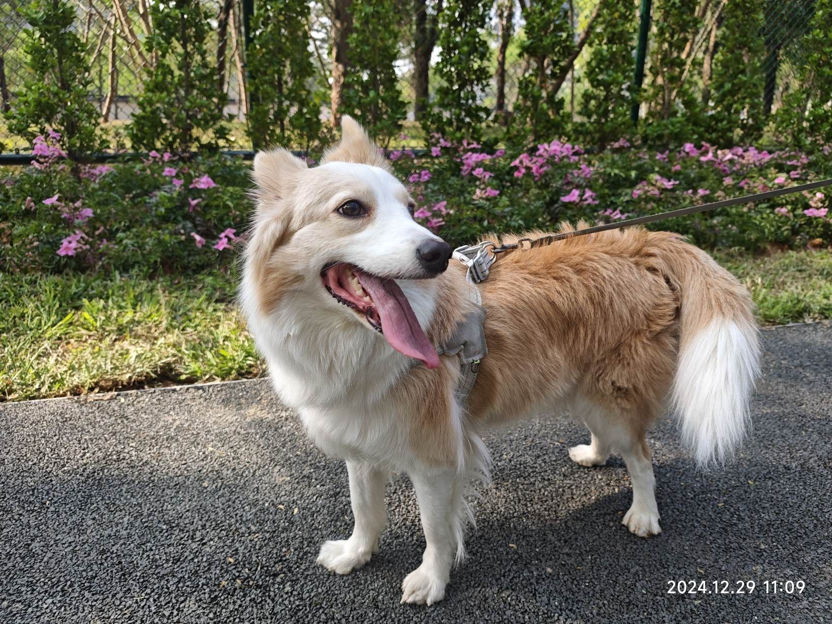 中午带蛋黄到小区外刚修好的绿道旁的空地运动,太久没有出门,激动的欢腾跳跃。围起来的封闭空间给她解开了绳子,小树在另外一边,结果来回飞速的跑了几趟就慢下来了,长时间在家太缺乏运动有些太肥了体力不行。